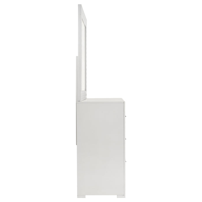 Bring a touch of modern luxury to your bedroom with this dresser and mirror set. Featuring a high gloss finish and 3-dimensional diamond tile emboss, this set exudes contemporary Italian style. The dresser offers ample storage with six spacious drawers, including felt-lined top drawers for delicate items. The matching mirror adds a cohesive element, enhancing the set's sophisticated design. This dresser and mirror set is perfect for those who appreciate refined aesthetics and quality craftsmanship. Key Features: • Luxurious dresser and mirror set with white high gloss finish • Dresser features six drawers with felt-lined top drawers • 3-dimensional diamond tile emboss for a modern touch • Matching mirror enhances the overall aesthetic • Constructed from solid hardwood and engineered wood