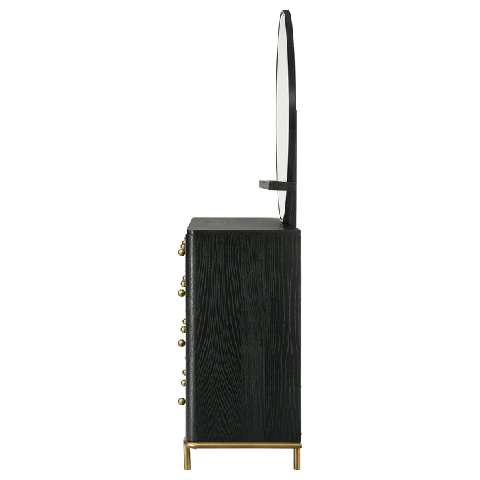 This mid-century modern dresser and mirror set blends elegant design with versatile functionality. The eight-drawer dresser features a wire-brushed sand wash finish, aged brass knobs, and slender metal legs for a refined touch. Felt-lined top drawers offer safe storage for delicate items, while softly rounded corners add subtle sophistication. Above, the round mirror includes a felt-lined tray and can be mounted to the dresser or hung independently on the wall, offering flexible styling and practical beauty for any bedroom._x005F_x000D_ Key Features: • Eight-drawer dresser in sand wash wire-brushed finish for natural texture • Aged brass knobs and slim metal legs offer modern mid-century charm • Felt-lined top drawers protect jewelry and delicate accessories • Round mirror includes felt-lined tray for storage and display • Mirror mounts to matching dresser or hangs freely on the wall • Crafted from rubberwood, engineered wood, and ash veneer