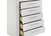 Organize your wardrobe in style with this contemporary chest. The high gloss finish and 3-dimensional diamond tile emboss provide a chic, modern look that enhances any bedroom decor. Five spacious drawers offer ample storage for clothing and linens, each with felt lining in the top drawers to protect your delicate items. The chest is built with robust materials and Pin construction joinery, ensuring durability and smooth functionality. This piece is both practical and stylish, perfect for a modern home. Key Features: • Contemporary chest with white high gloss finish • Five drawers with felt-lined top drawers for added protection • 3-dimensional diamond tile emboss adds texture and elegance • Pin construction joinery and metal glides ensure durability • Made from solid hardwood and engineered wood