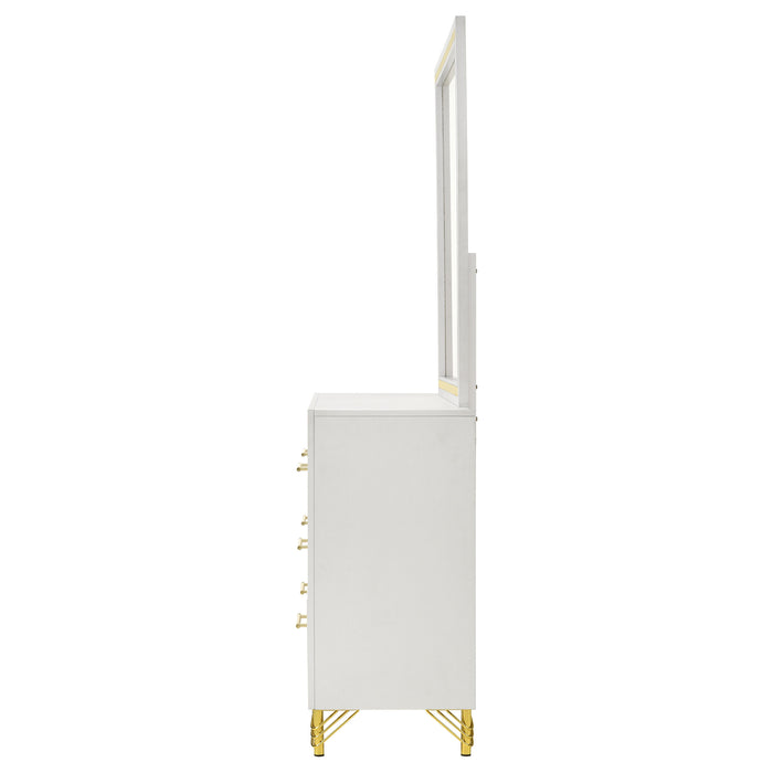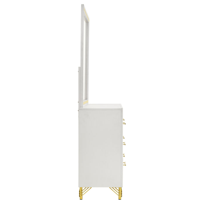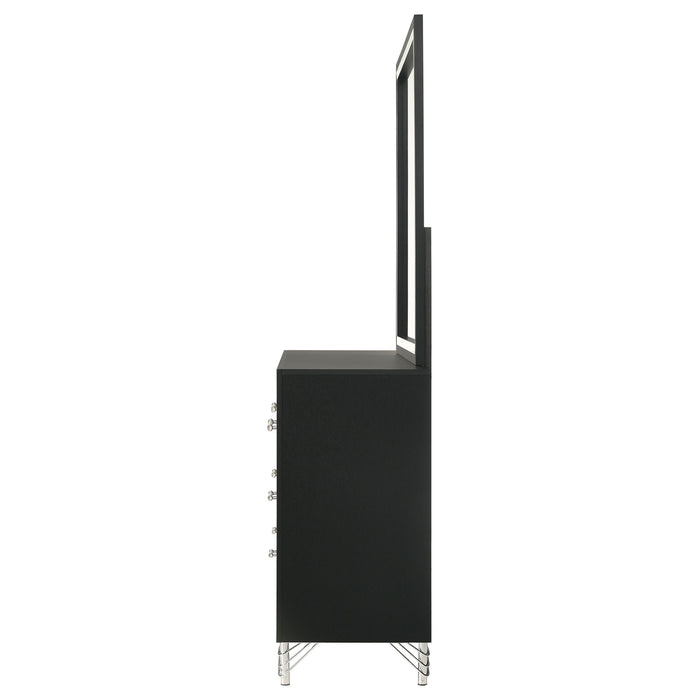 Introduce sophisticated and a hint of glamour with a modern six-drawer dresser and mirror set. Perfect for your stylish bedroom, it offers roomy drawers with smooth interiors perfect for clothing and accessories. The dresser features a bold black finish, with bands of shiny chrome trim and matching hardware and legs. The mirror on top is framed to match the front of the case, creating a sense of cohesion and richness in your dressing area. Decorative legs add a glam touch while the wide top is ideal as a vanity or for decor. Key Features: • Glam flair infuses a modern six-drawer dresser and mirror set to offer a bright, bold addition in any bedroom • Six spacious drawers create plenty of space to organize clothing, accessories and linens • Glossy chrome finish trim complements matching bar pulls and decorative legs to bring gleaming warmth • Included mirror features non-beveled glass and felt lining for a polished finishing touch • Melamine veneer is design for durability, with a white finish that's crisp and clean