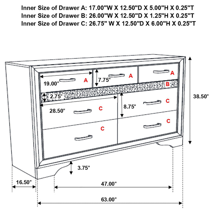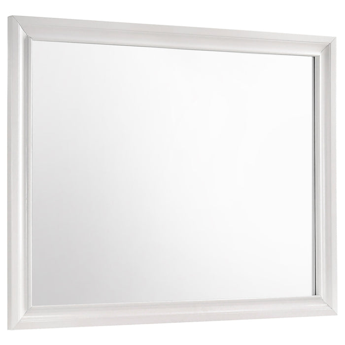 Encourage a glam vibe in your refined bedroom with a modern four-piece bedroom set. Centering on a stylish bed with an upholstered headboard and low footboard, the set includes a two-drawer nightstand for easy bedside storage and display space. A seven drawer dresser and mirror complete the set, adding diamond-like trim across its face that catches the light and offers a sophisticated touch. Bracket feet add a touch of dimensionality and movement to each piece and jewel-like bar pulls add intriguing sparkle. A cool white finish is textured, while white finish trim is smooth, creating a touch of textural contrast that add engaging style. Key Features: • Bedroom set with upholstered panel bed featuring glitter-accented headboard stripe • Textured white panel surfaces contrasted by smooth white molded trim throughout • Low profile footboard and bracket legs offer a modern and airy foundation • Storage cases include secret jewelry drawers behind glittery front panels • Drawers are felt-lined and glide on full-extension hardware for smooth operation • Crystal-style handles and sparkling trim provide glam-inspired sophistication