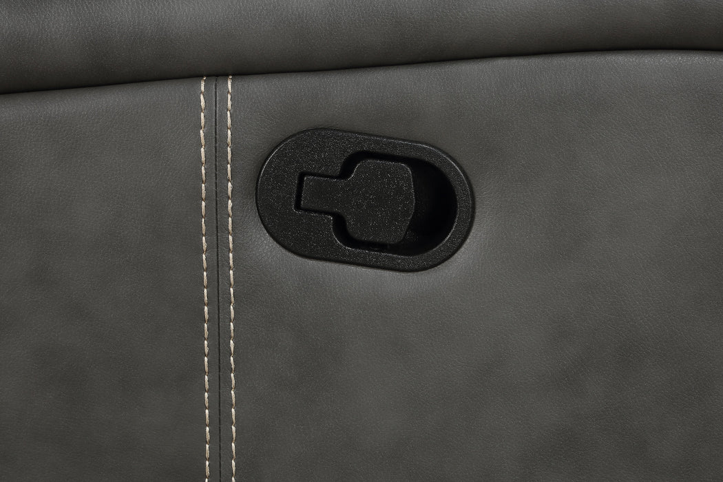 Relax in style with this transitional motion sofa that blends modern design and everyday comfort. Upholstered in smooth grey leatherette, it features decorative vertical topstitching for added dimension and appeal. Plush foam padding and pocket coil spring cushions provide long-lasting support, while ultra-padded headrests enhance relaxation. A wall-hugger reclining mechanism saves space, making this sofa a smart fit for any living area. Manual reclining allows customized comfort with ease._x005F_x000D_ Key Features: • Motion sofa upholstered in smooth grey leatherette with decorative topstitching • Manual reclining seats offer customizable comfort for everyday relaxation • Wall-hugger mechanism saves valuable floor space in compact living rooms • Plush foam cushioning and pocket coil springs provide lasting supportive seating • Attached back cushions with ultra-plush headrests enhance lounging comfort • Sturdy frame built with metal and plywood ensures durability and stability